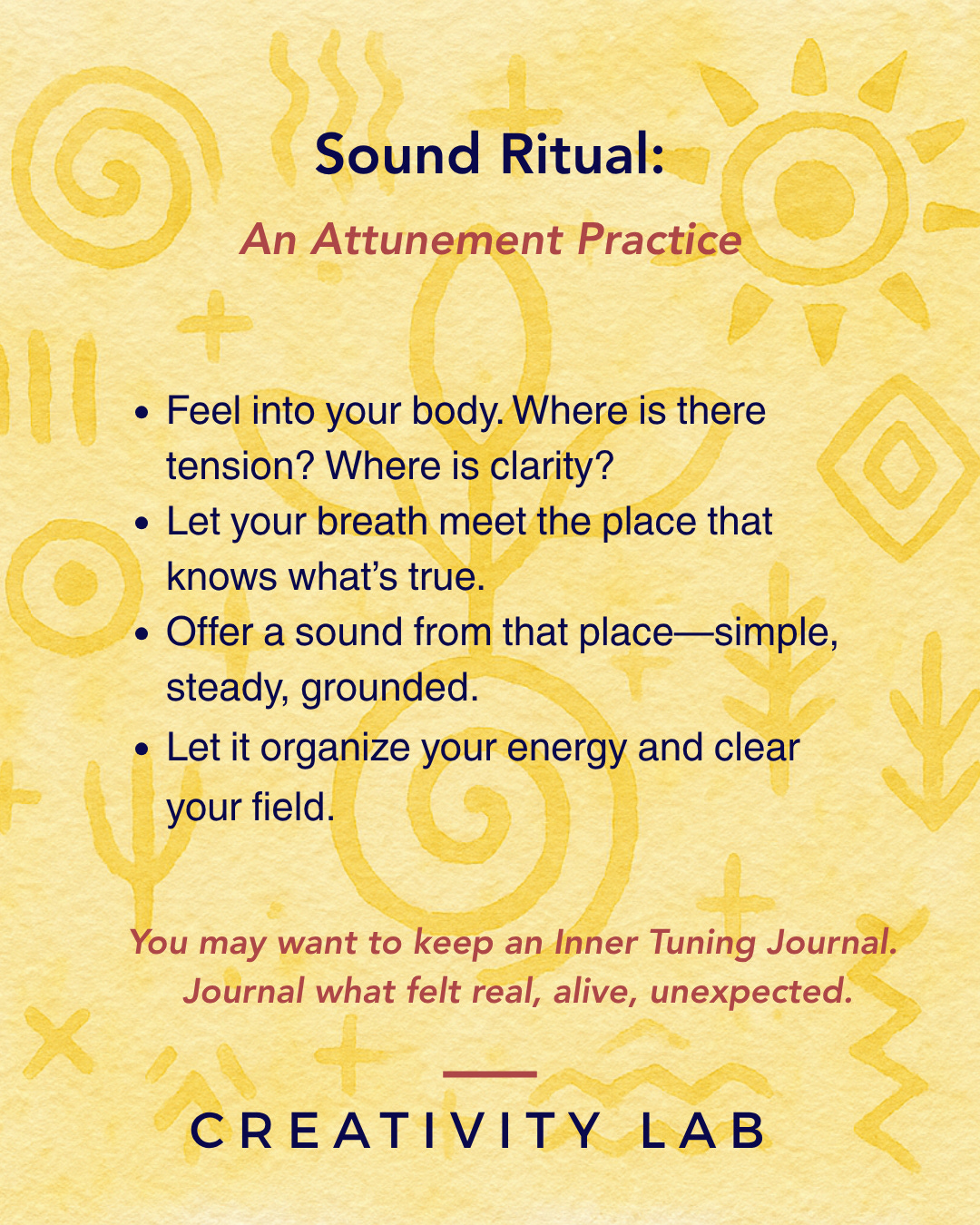 Daily Inner Tuning is a three-part practice of presence, reflection, and sound. It offers a gentle rhythm to return to—a space to listen more deeply, not just with your ears, but with your whole being.
